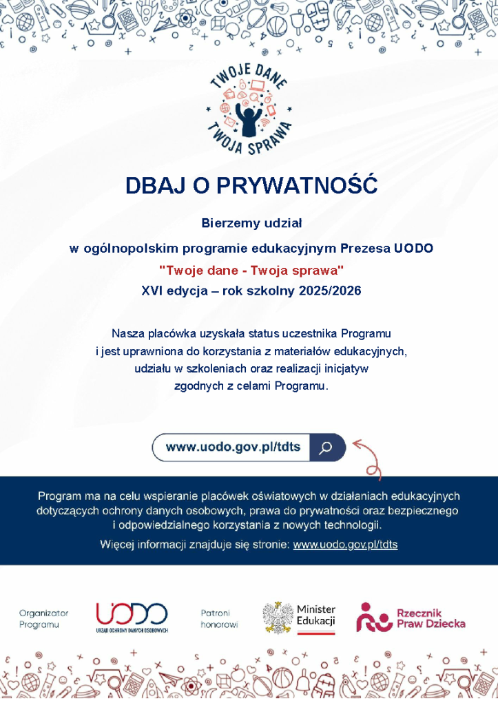 Nasza szkoła w roku szkolnym 2020/2021 przystąpiła do ogólnopolskiego programu edukacyjnego Twoje dane Twoja sprawa. Program realizowany jest pod honorowym patronatem Ministra Edukacji Narodowej oraz Rzecznika Praw Dziecka w celu podniesienia kompetencji nauczycieli oraz kształtowania świadomych i odpowiedzialnych postaw wśród uczniów.